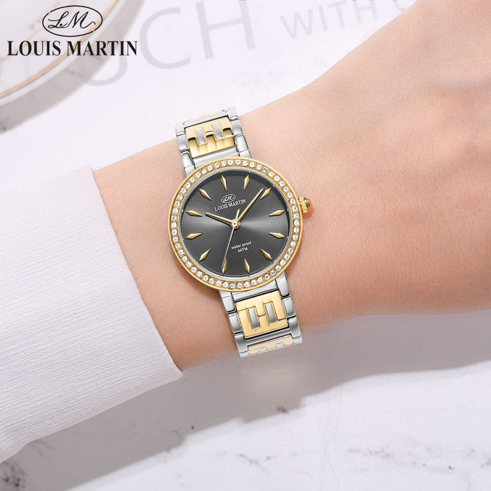 • ساعة نسائية تتسم بالسحر والأنوثة بإمتياز تحاكى شخصية إمرأة تعشق الجمال ، إطار دائرى مرصع بحبات الكريستال اللامع والبراق ، عقارب ومؤشرات الساعة ملفتة وسوار مريح على اليد ، مينا مختومة بالماركة ، إضافة مناسبة للإرتداء اليومى والمناسبات